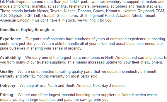 All our lift truck parts are offered at the best prices. Give us a phone call today if you are interested in receiving a price quote for our parts or attachments. Our number is: